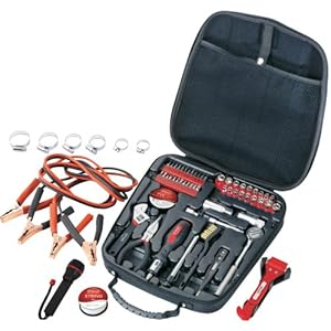 A small and compact Tool Kit for use and easy storage in a car, boat or RV. Each set contains: tire gauge, nylon string, electrical tape, voltage tester, plastic flashlight, 7' booster cable, ratcheting bit driver, 7" brass wire brush, 6" long nose pliers, 3/8" x 1/4" adaptor, 6" adjustable wrench, 3/8" socket ratchet handle, 3/8" drive 5/8" sparkplug socket, 1/4" drive 3" socket extension bar, 3/8" drive 13/16" sparkplug socket, six hose clamps, twelve 1" bits: T15, T20, T25, T27, T30, H1/8", H5/32", H3/16", H1/8", PH1, PH2, PH3. Also includes twelve 1" bits: 1/8", 5/32", 3/16", 1/4", PH1, PH2, PH3, PZ0, PZ1, PZ2, PZ3, 1/4" adapter, nine 1/4" drive metric sockets, nine 1/4" drive SAE sockets, life hammer.